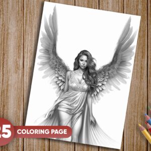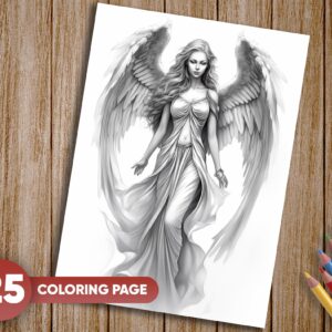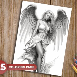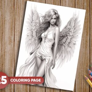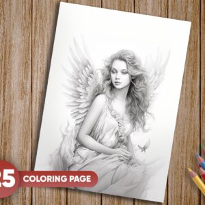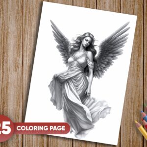 25 Unique Grayscale Illustrations: Each page showcases an angelic woman in various serene and ethereal settings, offering a diverse range of coloring experiences.