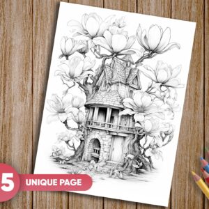 25 meticulously detailed grayscale coloring pages featuring delightful fairy homes