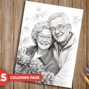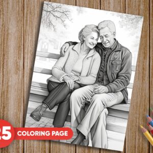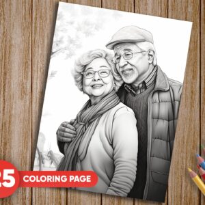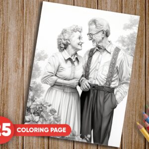 This enchanting grayscale coloring book captures the essence of timeless love stories, featuring elderly couples who have weathered life’s storms together.