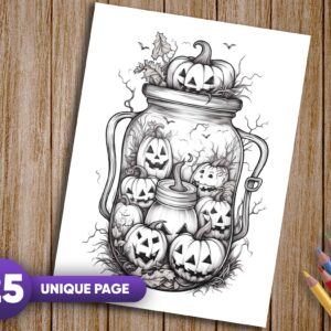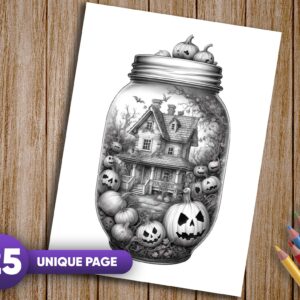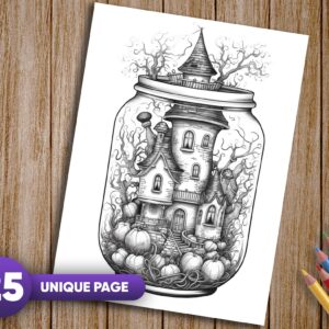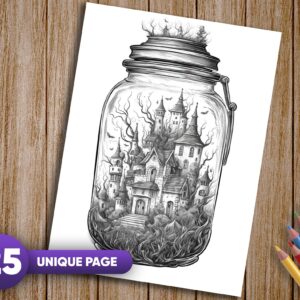 25 meticulously detailed grayscale coloring pages featuring Halloween-inspired scenes in jars