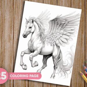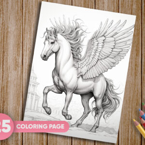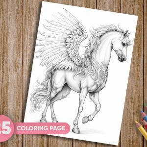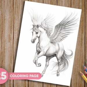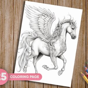 mbark on a magical coloring adventure with our captivating collection of 25 Pegasus, Fairy Tale, Fantasy, and Horse Coloring Pages. Delve into the enchanting world of mythical creatures and majestic horses with this grayscale coloring book that offers a truly unique and artistic coloring experience. Instantly downloadable, these printable PDF pages invite you to bring your creative vision to life.