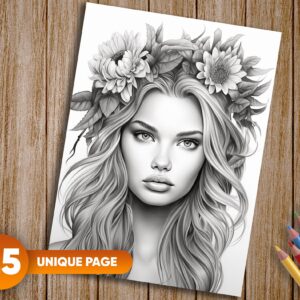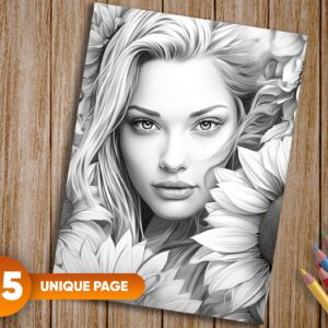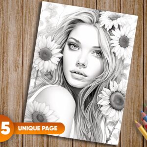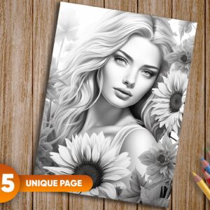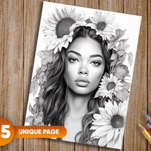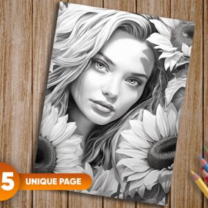 25 exquisitely detailed grayscale coloring pages showcasing beautiful women and sunflowers