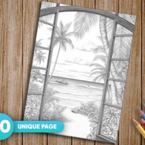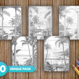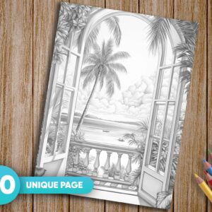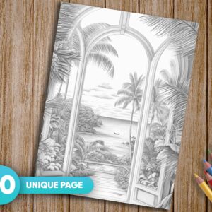 30 meticulously designed grayscale coloring pages featuring stunning vistas of tropical paradises seen through windows